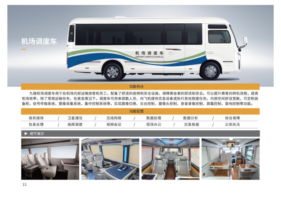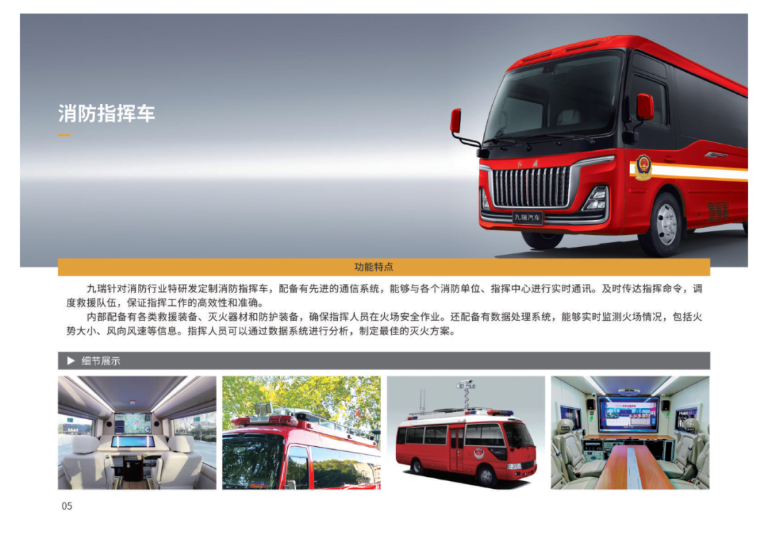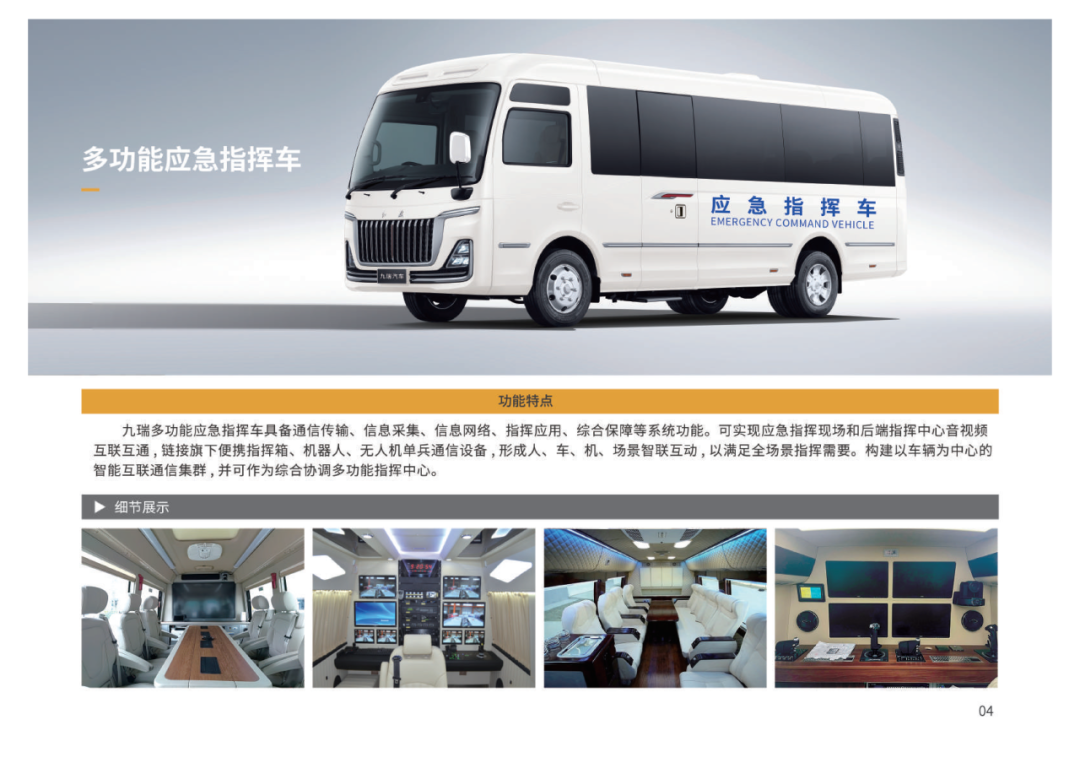 一汽紅旗與九瑞汽車強強聯(lián)合、雙向賦能,共同打造汽車生產(chǎn)廠商與應(yīng)急裝備制造企業(yè)優(yōu)勢互補、聯(lián)合創(chuàng)新的合作典范。 ·多功能指揮車 ·消防指揮車 ·移動衛(wèi)星基站車 ·衛(wèi)星通信車 ·移動應(yīng)急管理平臺 ·公安指揮車 ·無人機巡檢車 ·氣象監(jiān)測車 ·無人機反制車 ·危險氣體檢測車 ·礦山綜合救援車 ·商務(wù)車 ·健康體檢車 ·宿營車 ·機場調(diào)度車 ·醫(yī)療車